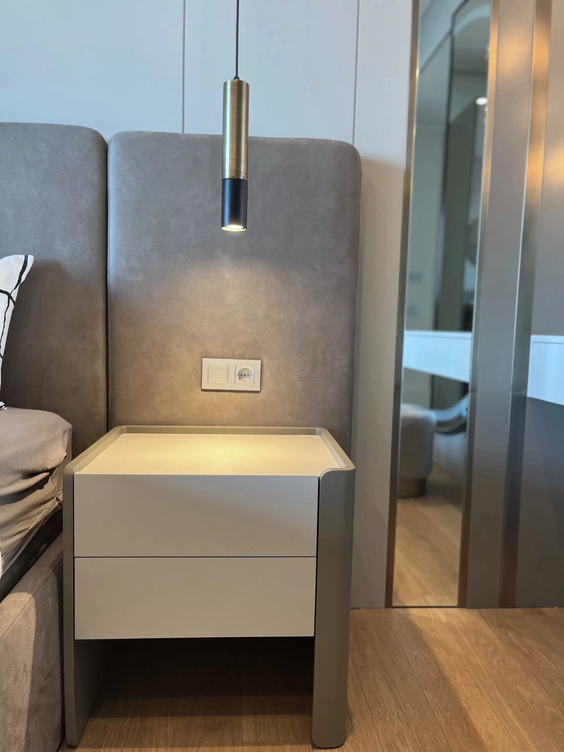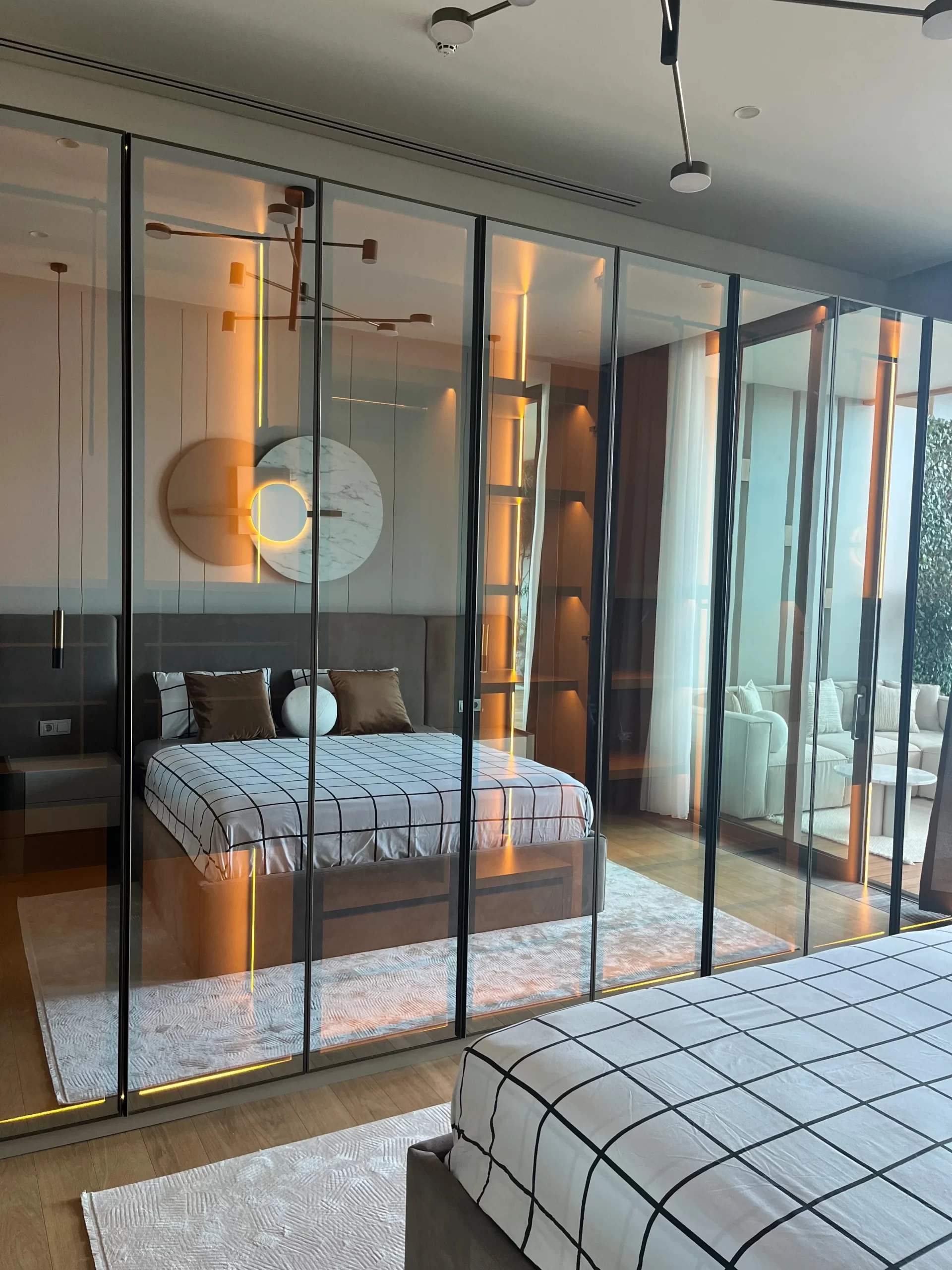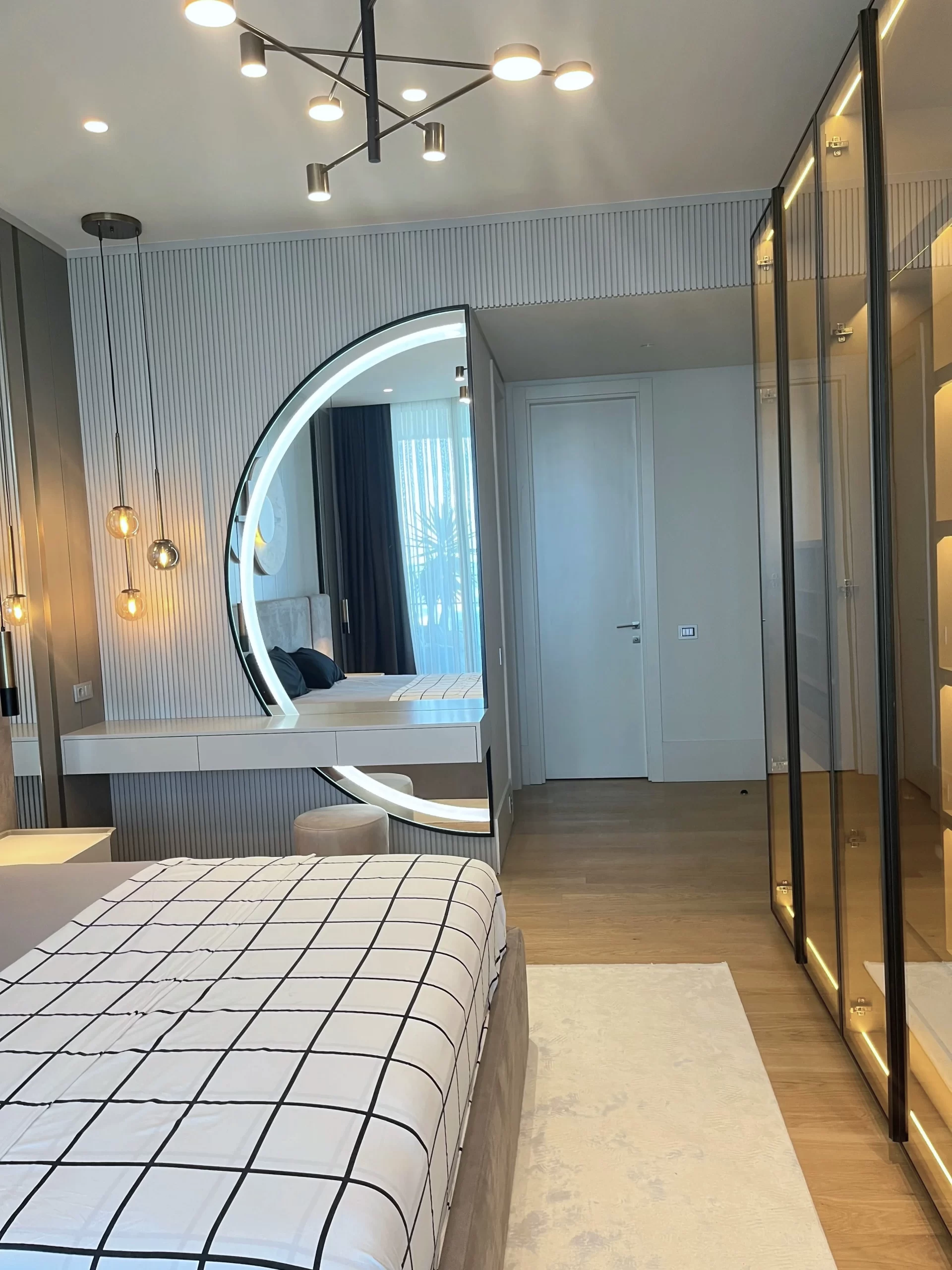 Bu iç mekân tasarımı, modern yaşamın lüks ve konforunu minimalizmle buluşturan, zarif ve sofistike bir anlayışın ürünüdür. Doğal ışığın bolca kullanıldığı geniş cam yüzeyler, yumuşak nötr tonlarla tasarlanmış salon alanı ve özenle seçilmiş aydınlatma elemanlarıyla mekâna ferahlık katarken, ahşap ve mermer detaylar sıcaklık ve lüks bir hava sağlar. Yatak odası ise pastel tonlar ve geometrik formlarla huzurlu bir uyku alanı sunar. Giriş alanı, sofistike aydınlatma ve dekoratif unsurlarla evin genel estetiğine entegre edilmiştir. Her detayın titizlikle düşünüldüğü bu proje, estetik ve işlevselliği bir araya getirerek modern iç mekân tasarımında yeni bir standart belirlemektedir.